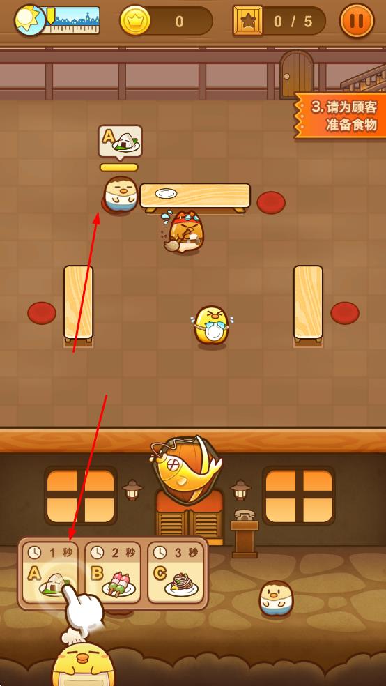 2、观察顾客头顶餐品需求,在下方选对应食物制作,把控烹饪时长。