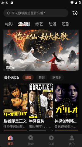 1、进入软件之后会发现内部布置很合理,并且是黑色主调,有电影、电视剧、综艺、动漫、短剧等分类。