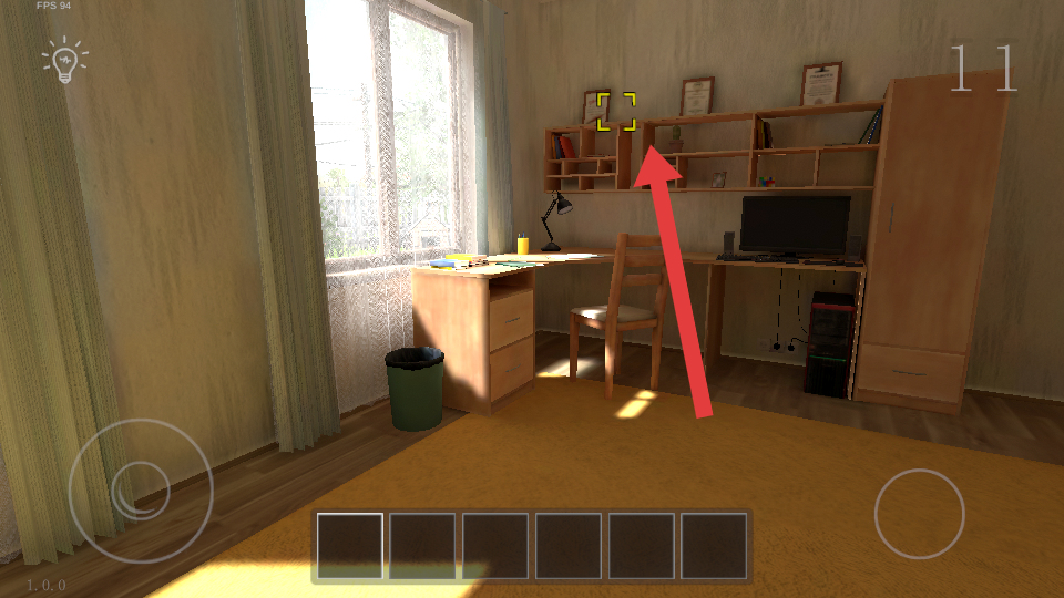 1、进入卧室,先检查书桌、书架,点击黄色方框标记区域,搜寻书籍、小物件,可能藏解谜线索。