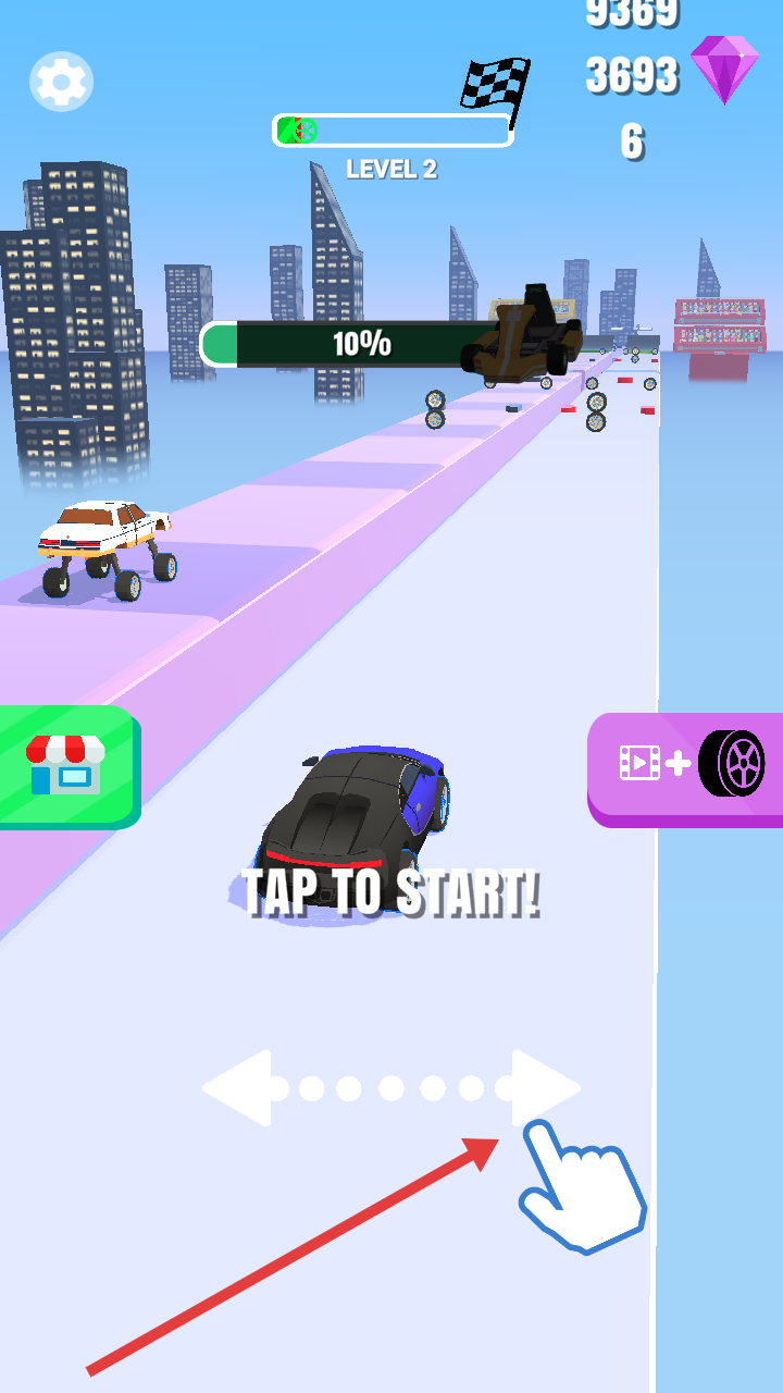 1、点击TAP TO START启动赛车,在城市悬空赛道,用左右箭头控方向,躲障碍、追前方车辆。