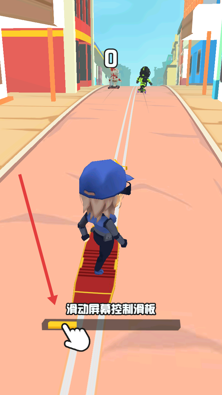 2、滑动屏幕控制滑板左右移动,灵活避开道路障碍,紧盯前方对手,找准时机完成超车。