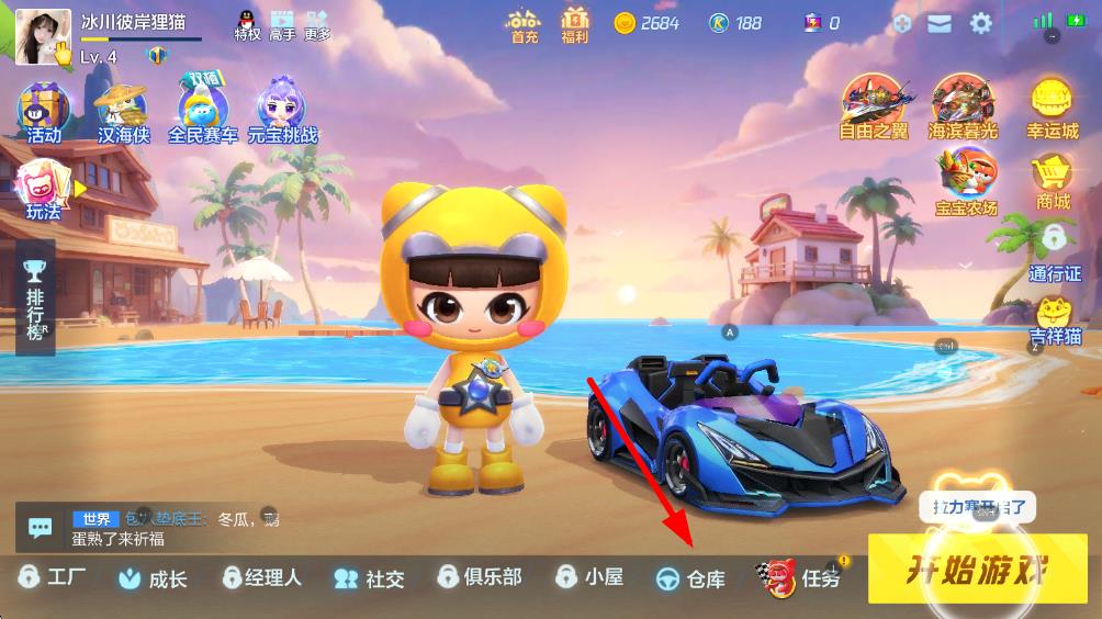 1、在跑跑卡丁车游戏中是通过切换车手角色来改变游戏内显示的性别外观,进入游戏主界面,点击下方导航栏中的仓库选项。