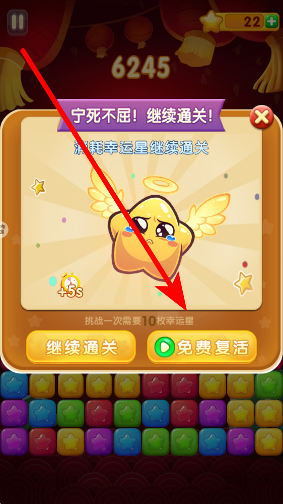 3、复活抉择时间耗尽后,可消耗幸运星继续或选择免费复活,前期分数可观,利用免费复活争取更多机会,冲击更高纪录,合理把控复活时机。