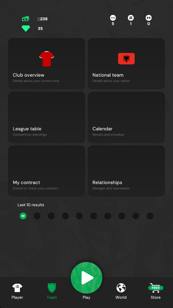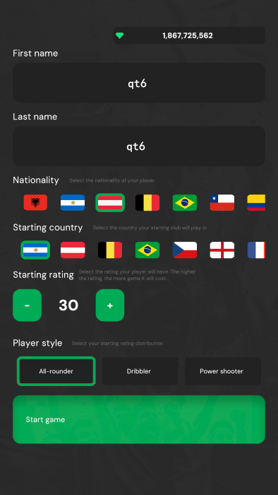 1.首先开始创建你的足球俱乐部,选择国家,选择初始值,还有擅长的玩法。