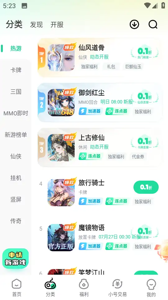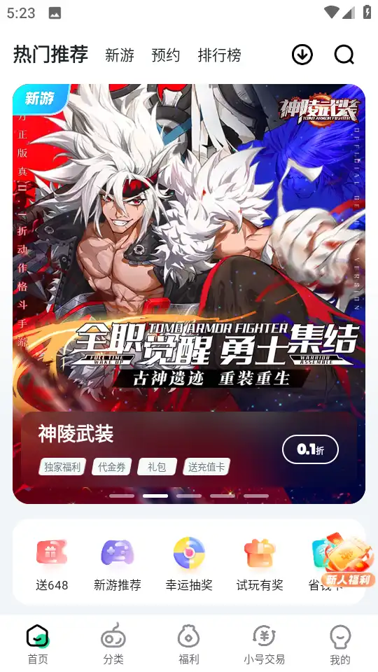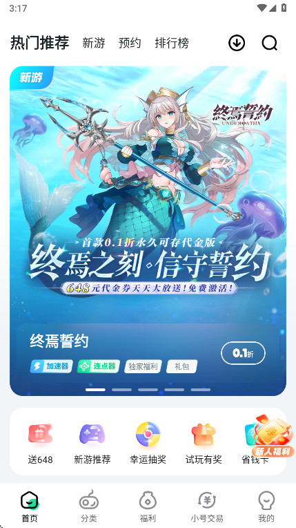 2、分类板块有爆款推荐,也有最新开服,以及开服预告。