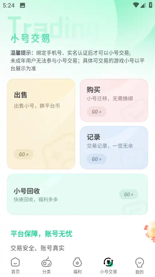 3、软件也支持小号交易,可以将闲置的小号出售,成交后可以获得平台币。