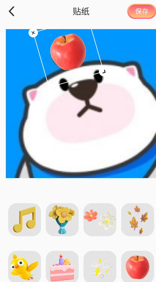 5、点击喜欢的贴纸,然后即可拖动贴纸至想要的位置,然后点击右上角的保存即可