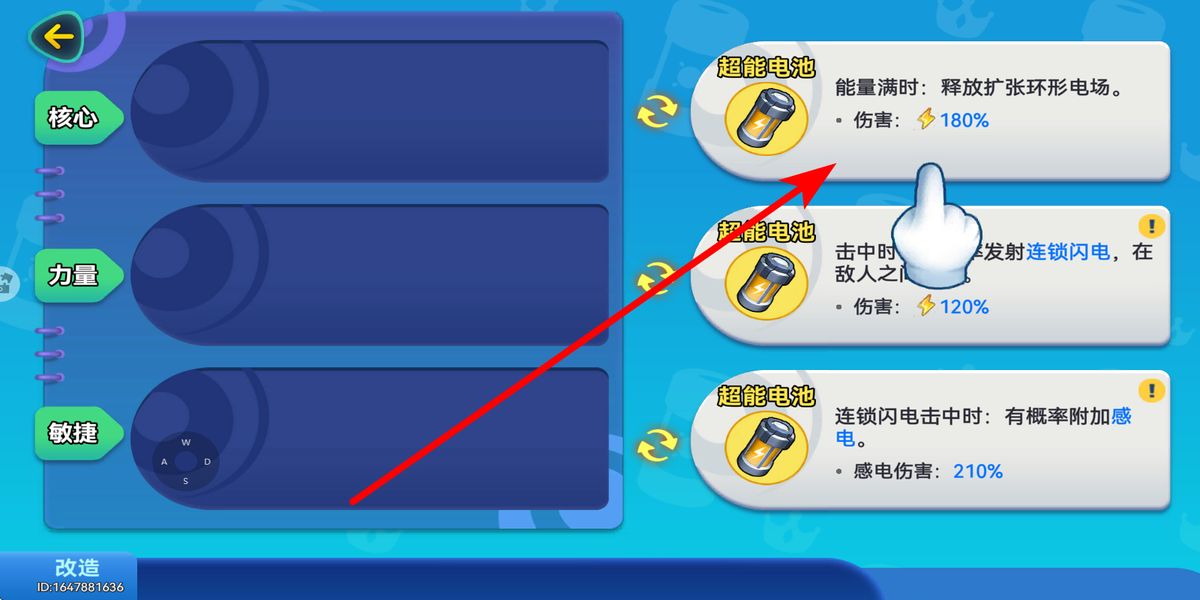 2、改造策略搭配改造界面中,依据当前敌人类型选宝物,如遇群体怪,优先选能量满释放环形电场的超能电池,强化技能AOE输出效果。