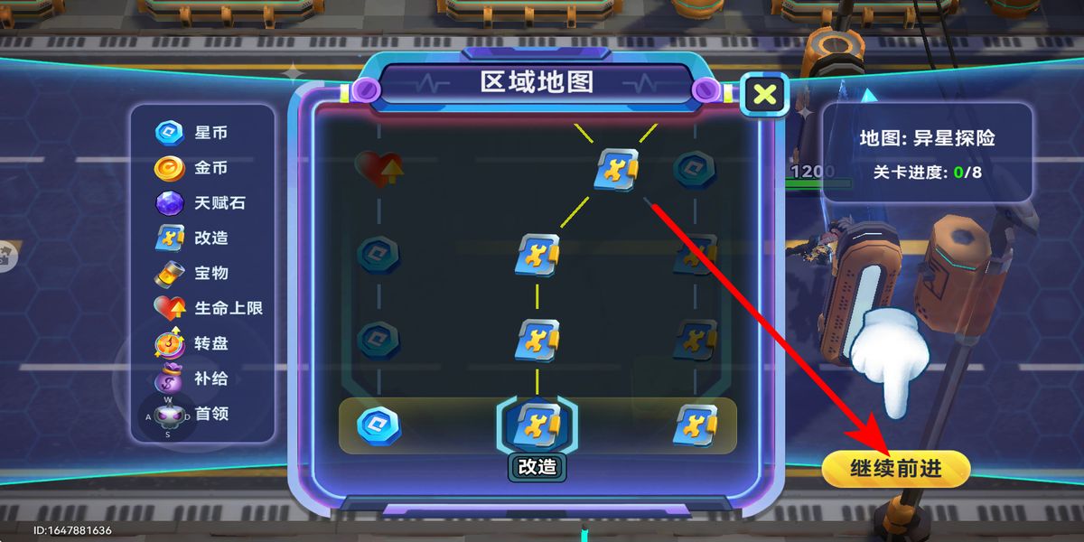 3、路线规划推进打开区域地图,筛选含改造宝物等节点的路线,完成节点交互后点击继续前进,借路线资源积累,推动关卡进度突破。