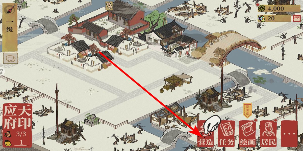 1、在应天府主场景,点击下方营造按钮,弹出建筑列表,可查看民宅等已解锁建筑,依据繁荣度与需求,消耗资源启动建造。