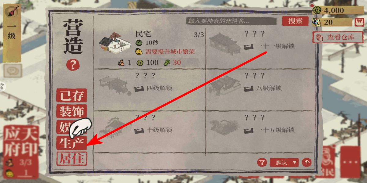 2、营造界面左侧设居住、生产等标签,点击居住优先建民宅,吸引居民入驻,生产类建筑可产粮草物资,保障城市的运转。