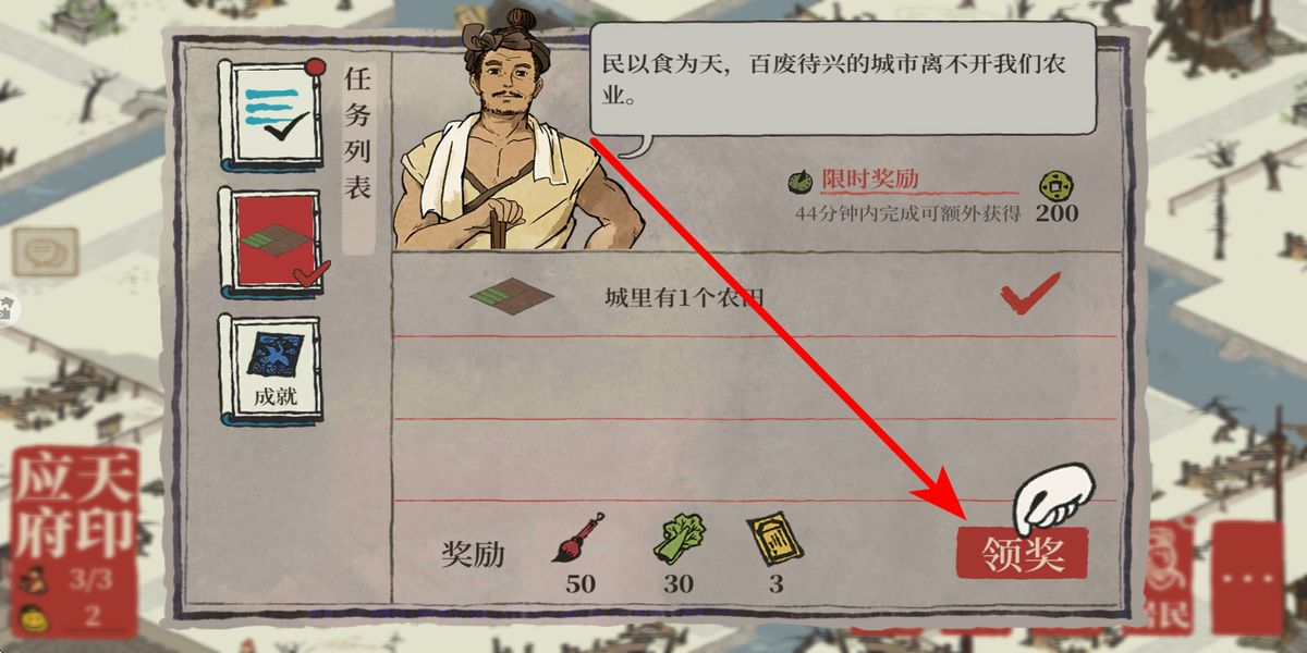 3、完成任务列表的目标建造农田,界面显示领奖按钮,点击获取道具、资源,积累素材解锁高阶建筑,推进城市建造的升级。