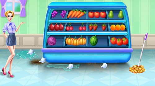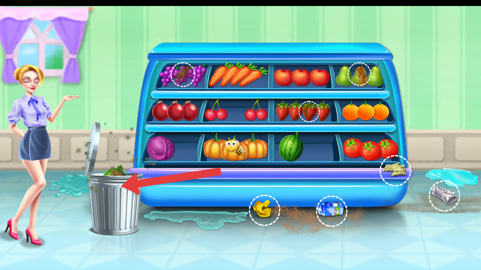 2、收拾好发霉坏掉的水果后,查看到地板上有污渍和水渍,点击旁边的拖把移动把地板清理干净。