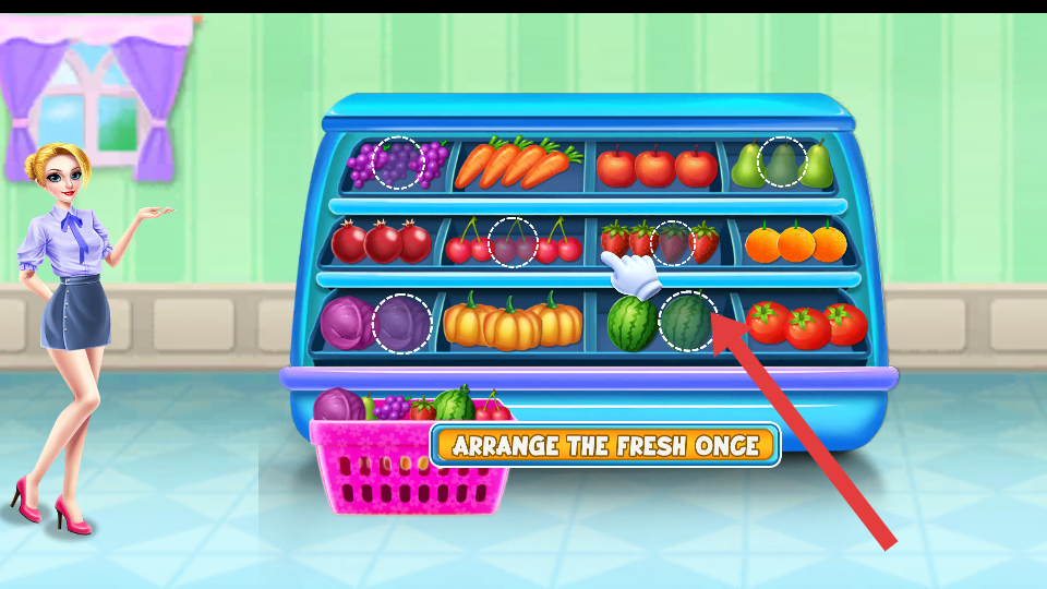 3、最后处理分类篮,按货架空缺补全,葡萄放第一排、卷心菜填第三排、西瓜和樱桃同理,完成任务。