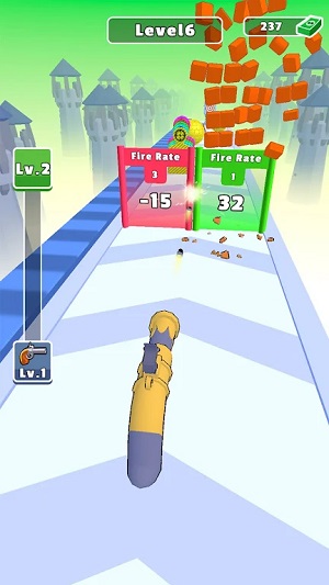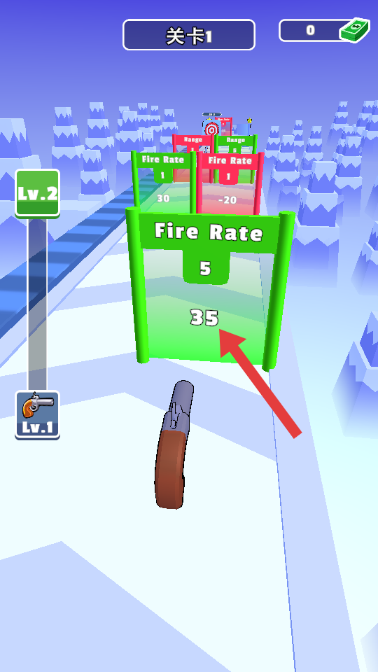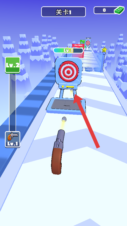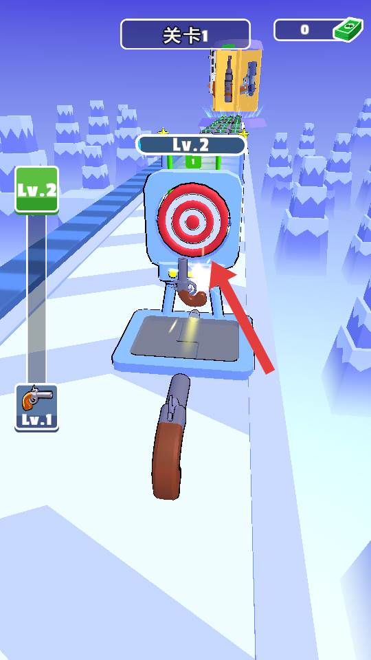 3、注意武器等级的初始Lv.1,通过射击升级靶子比如Lv.1升Lv.2,解锁更强的武器,推进后面的关卡。