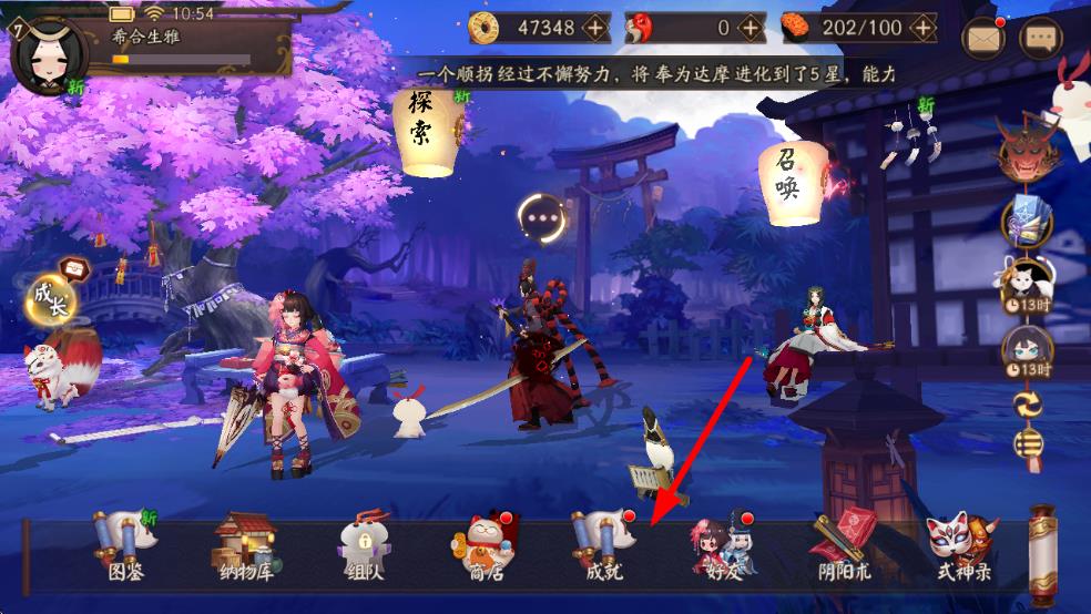 1、点击游戏主界面右侧箭头指向的图标,再点击下方菜单栏成就进入成就界面。