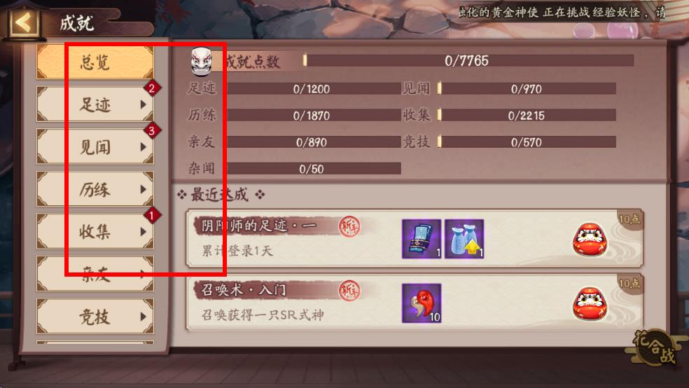 2、在成就界面,通过左侧分类栏可查看总览、足迹、见闻等不同分类的成就内容。
