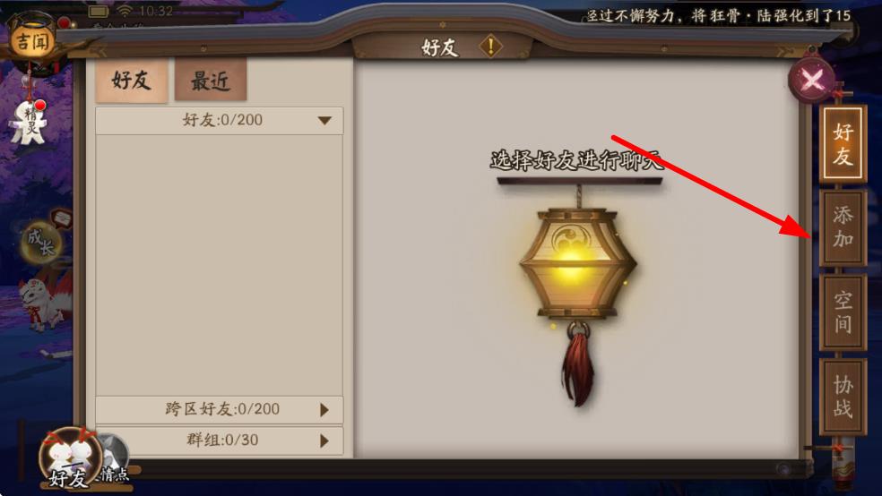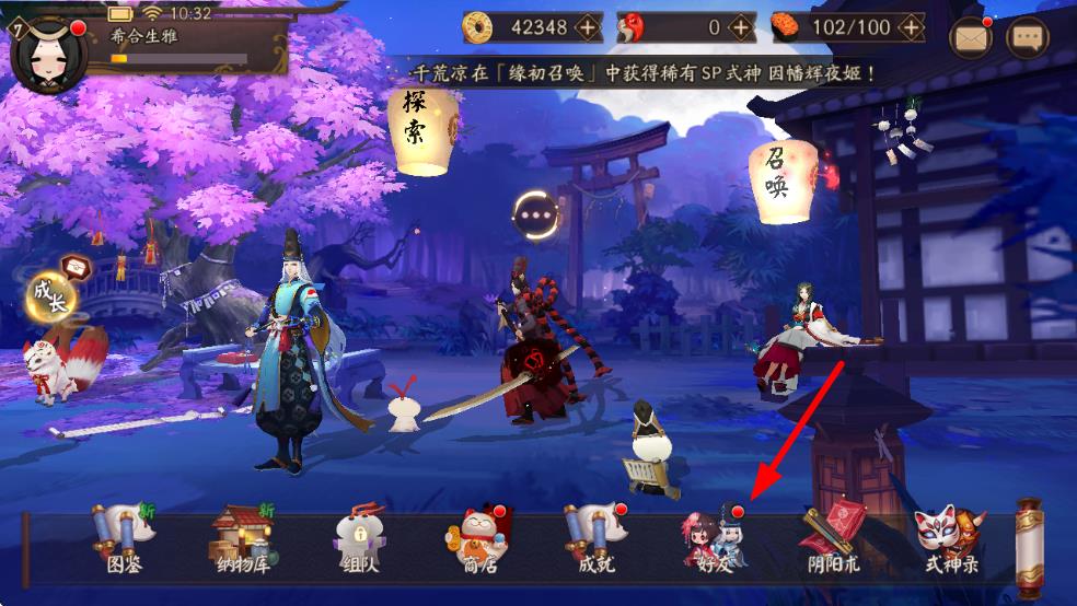 1、进入阴阳师游戏主界面,点击下方菜单栏中的好友图标。