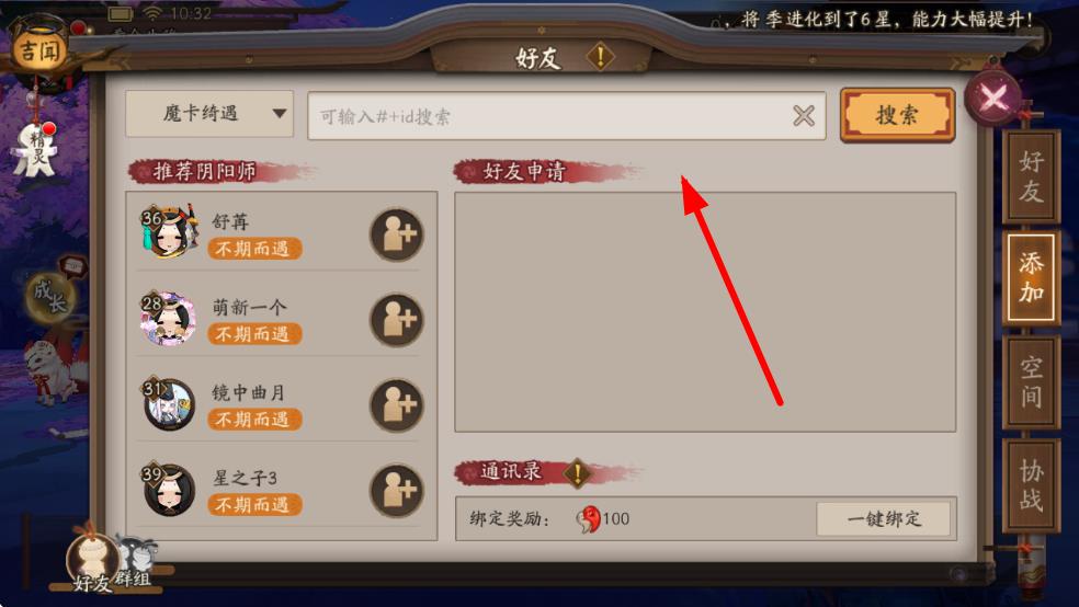 3、在添加好友界面,可以通过输入id进行搜索,或者点击推荐阴阳师后的加好友按钮来添加好友。