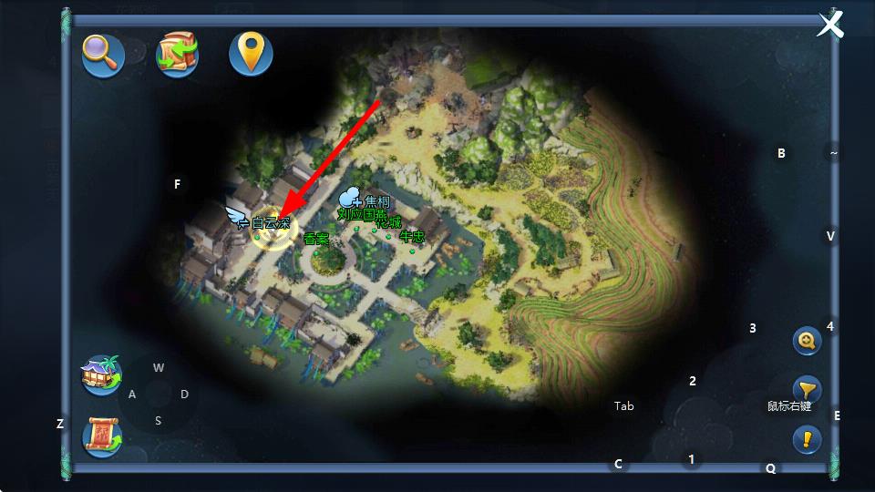 2、在大地图界面可查看场景中各个地点位置,点击目标地点标识如白云观等。