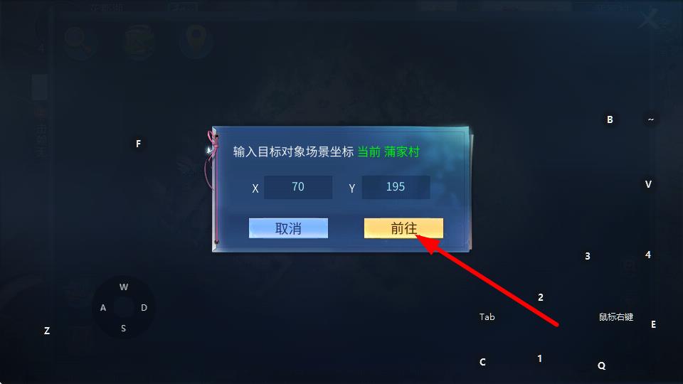 3、弹出坐标输入框后,确认坐标点击前往按钮,角色即可自动寻路前往目标地点。