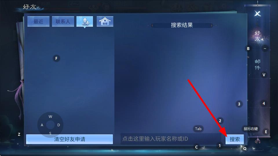 3、在输入框中输入玩家名称或ID,点击搜索按钮,找到目标玩家后发送好友申请。