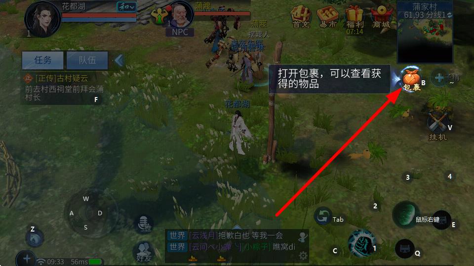 1、进入游戏场景点击屏幕右侧包裹按钮,查看获得的物品,开启装备操作流程。