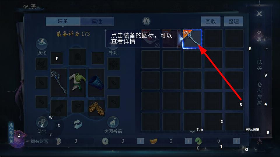 2、在包裹界面,点击装备图标可查看装备详情,了解属性等信息。