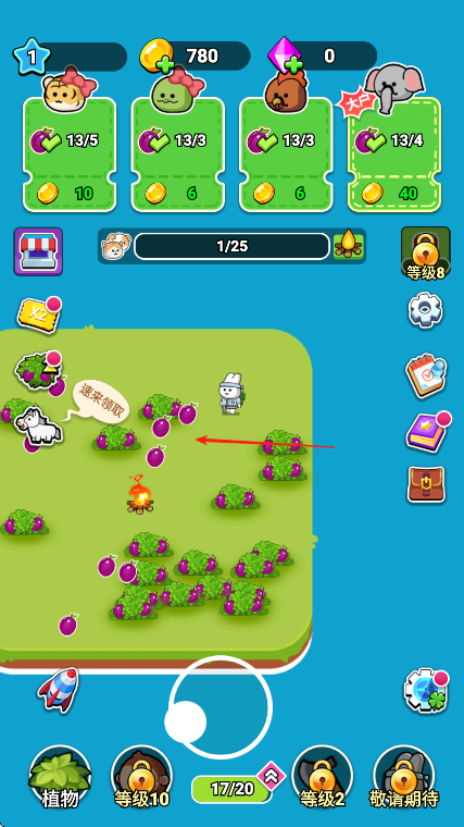 2、通过点击屏幕下方的虚拟摇杆,控制角色在种植区域移动,靠近原料作物后,自动采集掉落的原料。