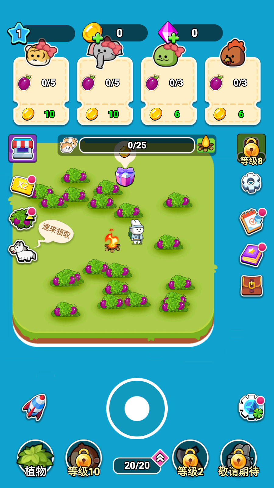 3、当收集的原料数量满足对应角色需求时,就能获得金币等奖励,不断重复采集过程,完成更多任务,提升等级。