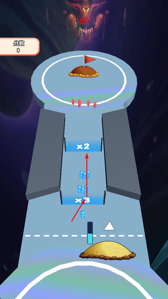 1、滑动箭头调整小人出发方向,使其通过路径上的倍数门x2,数量倍增。