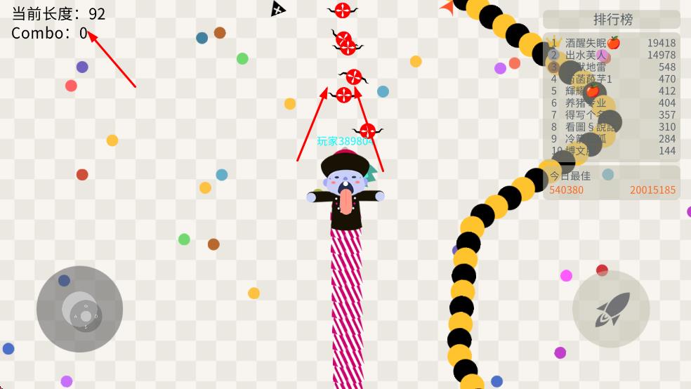 2、用虚拟摇杆操控角色移动,吞噬场景彩点,增长长度,拾取火箭道具加速。