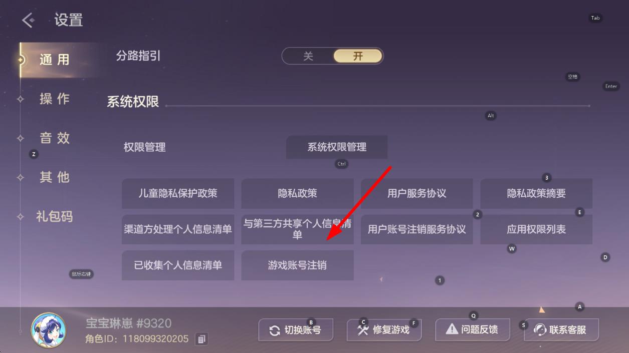 2、在设置页面的通用分类下,下滑找到游戏账号注销选项,点击进入账号注销流程页面。