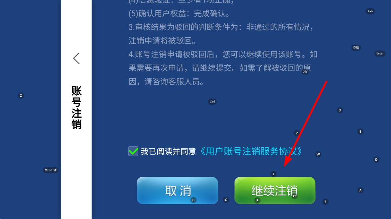 3、在账号注销页面,点击继续注销按钮,按照后续提示完成身份验证等操作即可提交注销申请。