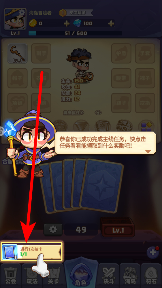 1、抽卡触发条件,完成主线任务后,界面左下角出现进行1次抽卡提示,点击消耗对应次数,触发抽卡机制,有概率获取装备道具等养成资源。