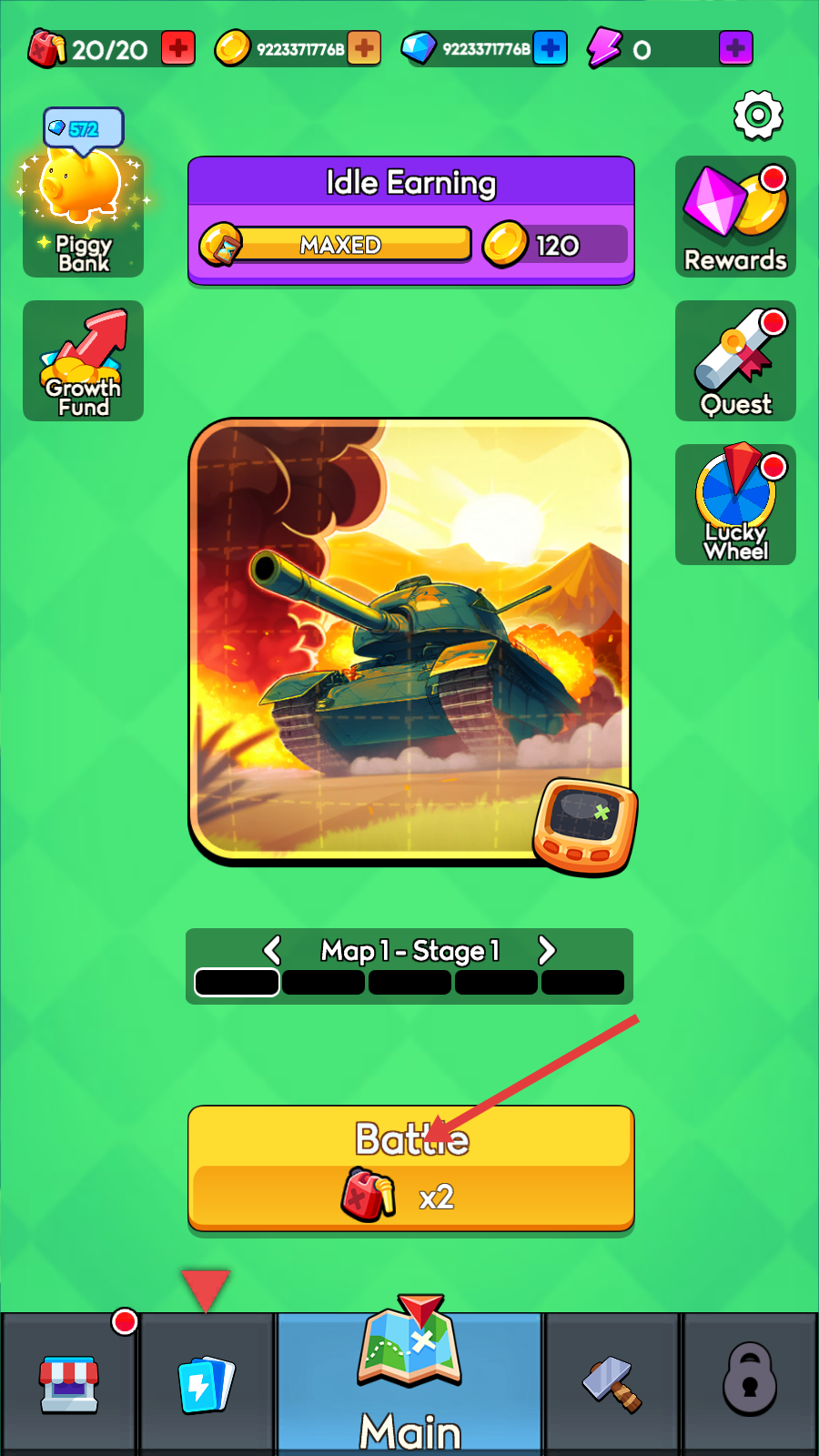 1、主界面点击【Battle-x2】,消耗体力开启【Map1-Stage1】,驾驶坦克投身首关战斗。