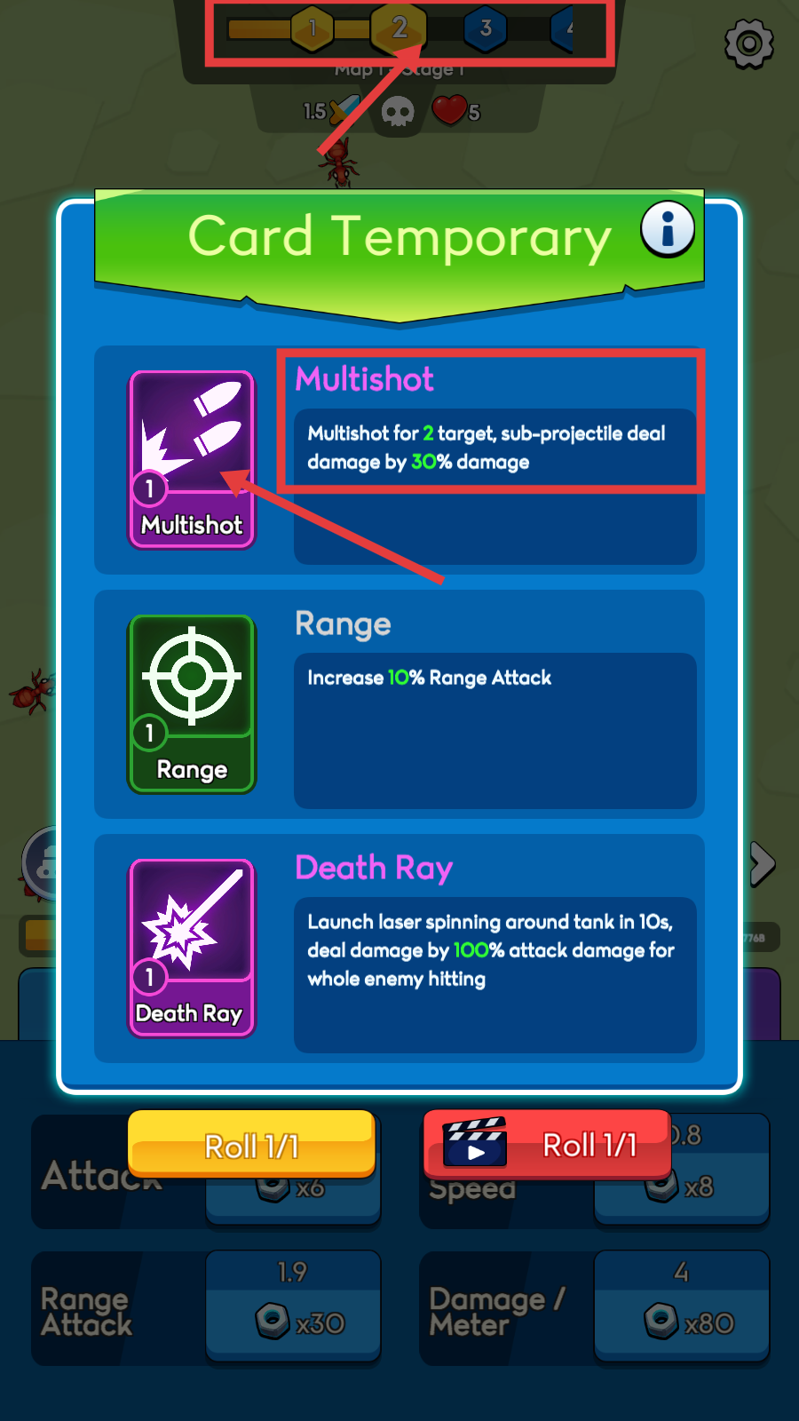 3、阶段2解锁【Card-Temporary】,选【Multishot】,可攻击2目标且子弹伤30%,提升输出。
