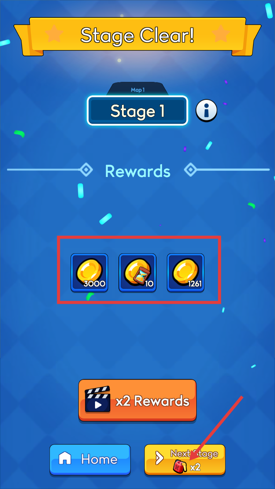 4、通关后领【3000-金币】等奖励,点击【Next-stage-x2】,携体力道具挑战下一关。