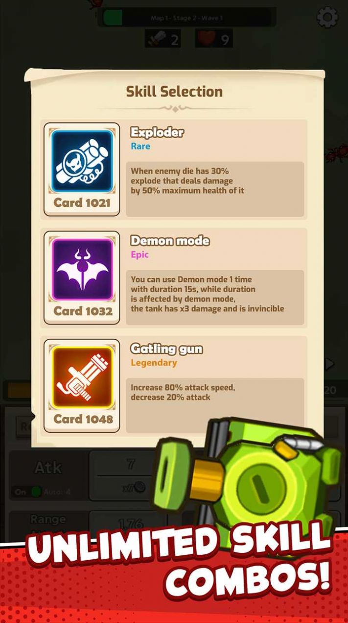 2、战斗时消耗【100-资源】,升级【Attack-15-x6】等属性,强化坦克抵御红蚁进攻。