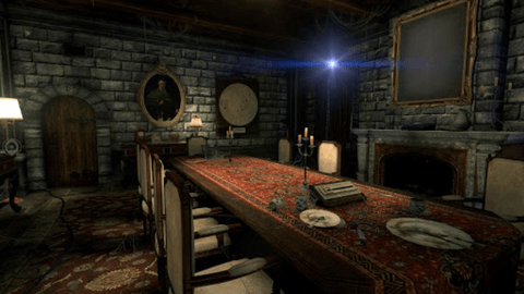 进入二楼房间,窗台上有明信片,旁边的桌子上有一页日记看看就好,打开右手边桌上的盒子有一块圆形拼图,正面桌子上有叉子和一本日记,打开旁边的红盒子里面有硬币,拼图安到地上,拼好地图拿走圆盘,出门发现刚刚路过的书架倒了,碰墙上的画会有个发蓝光的东西飞出来,安盘子一楼左边的房间打开。