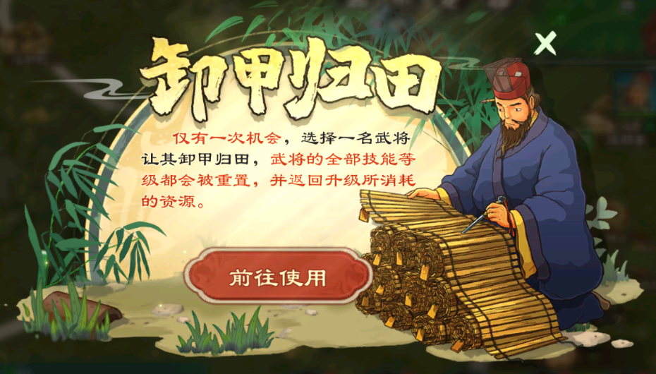 解甲归田可以选择一名武将进行重置,之前用于该武将培养该武将的道具、资源会全部返还。但是这个活动只有未合服的时候才有,所以想重置武将的话需要在合服前使用。