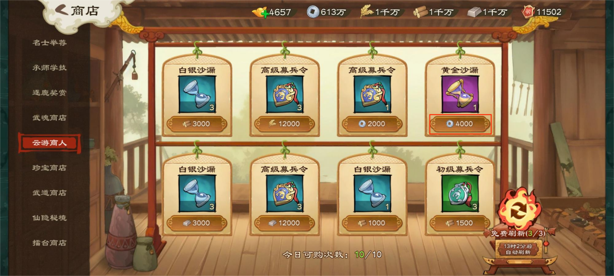 云游商人这里可以用木材、铁矿和银币来兑换黄金沙漏。