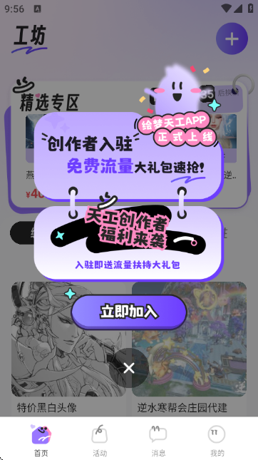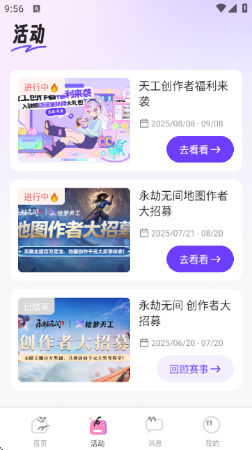 5、进入“活动”板块,实时查看平台最新福利活动、主题赛事、创作挑战等精彩内容推送。