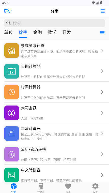 1.打开极巧立算,可以看到首页主要有单位、效率、金融、数学、开发等几个大板块内容。