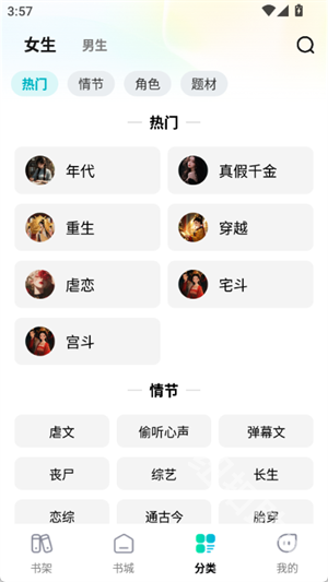 4、进入分类板块,还能够筛选男频女频,以及小说题材,类型等,让小说筛选更精准,更偏向性