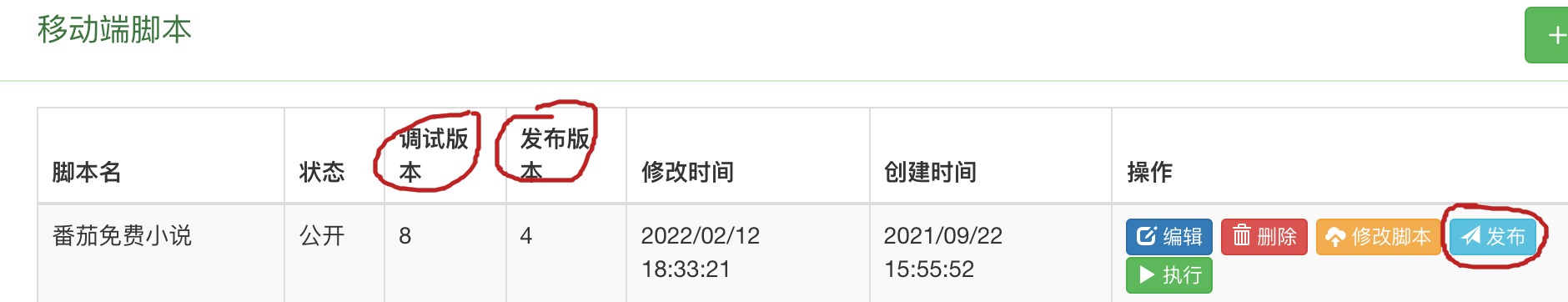 点击脚本对应的"发布"按钮,即可将最新的调试版本同步到部署版本(部署版脚本只能运行在发布模式的设备上,注意部署脚本后其他人看不见,仅自己可见。)