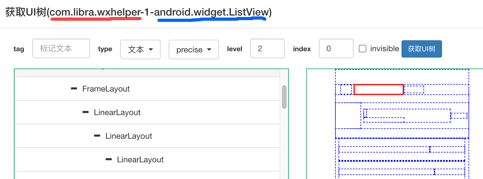 将app切换到前台,然后点击"UI树",上部分会显示当前app的包名,如下图所示:红色部分是包名,蓝色部分是windowClassName