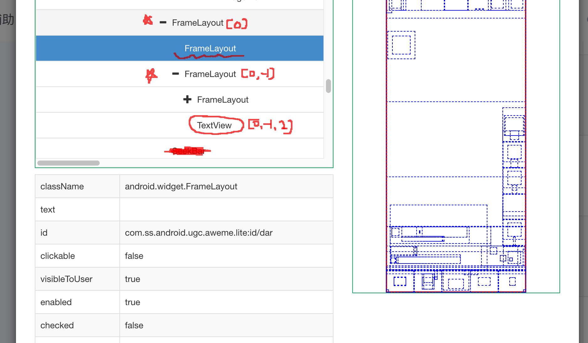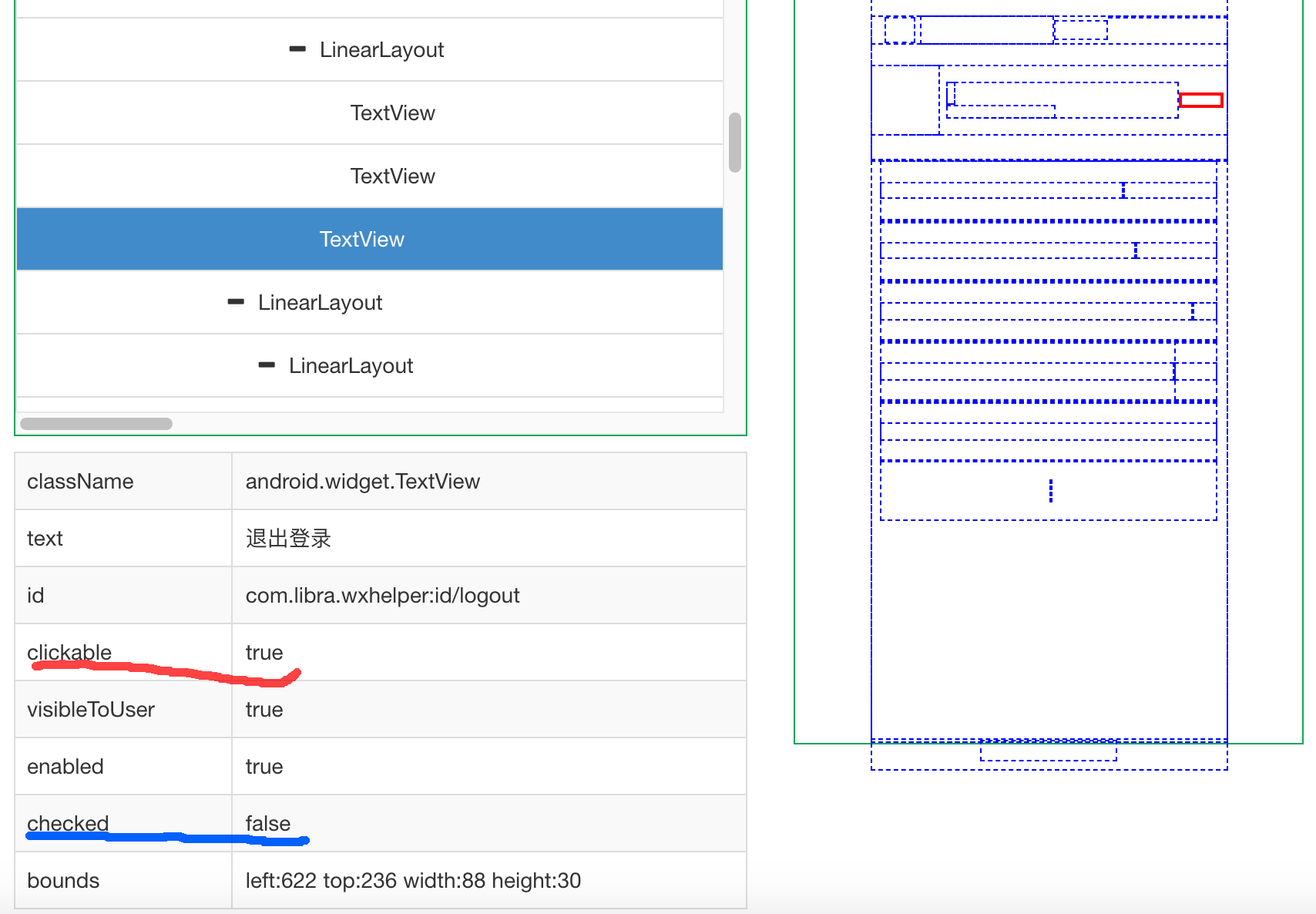 获取UI树后,如下图所示:红色部分为true表示控件内置点击功能,蓝色部分为true表示控件被选中
