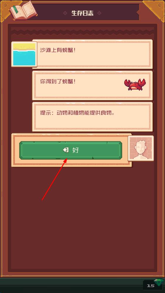 2、探索海滩后,会弹出“生存日志”界面,点击绿色“好”按钮,确认获取的螃蟹等信息,了解动物植物可提供食物的提示内容 。