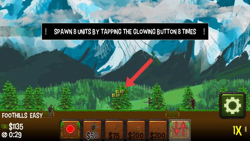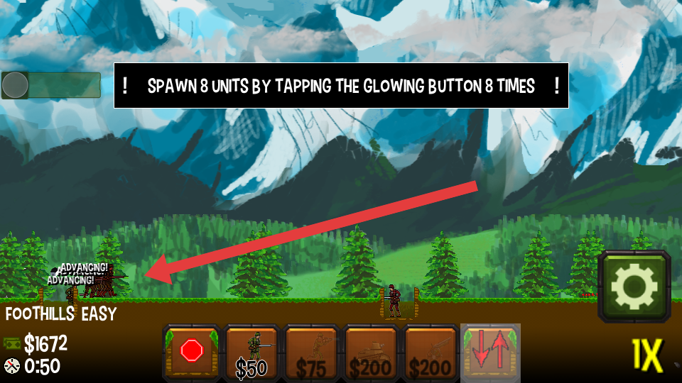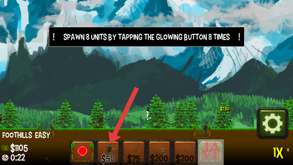 1、进入关卡,看到提示,找到下方$50对应的发光兵种按钮,点击召唤单位,消耗金币需8×$50,确保金币足够。